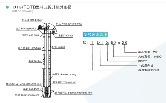 1.This type elevator is good look in shape, it has the same dimension with TDTG bucket elevator of the same model and with good interchangeability.
